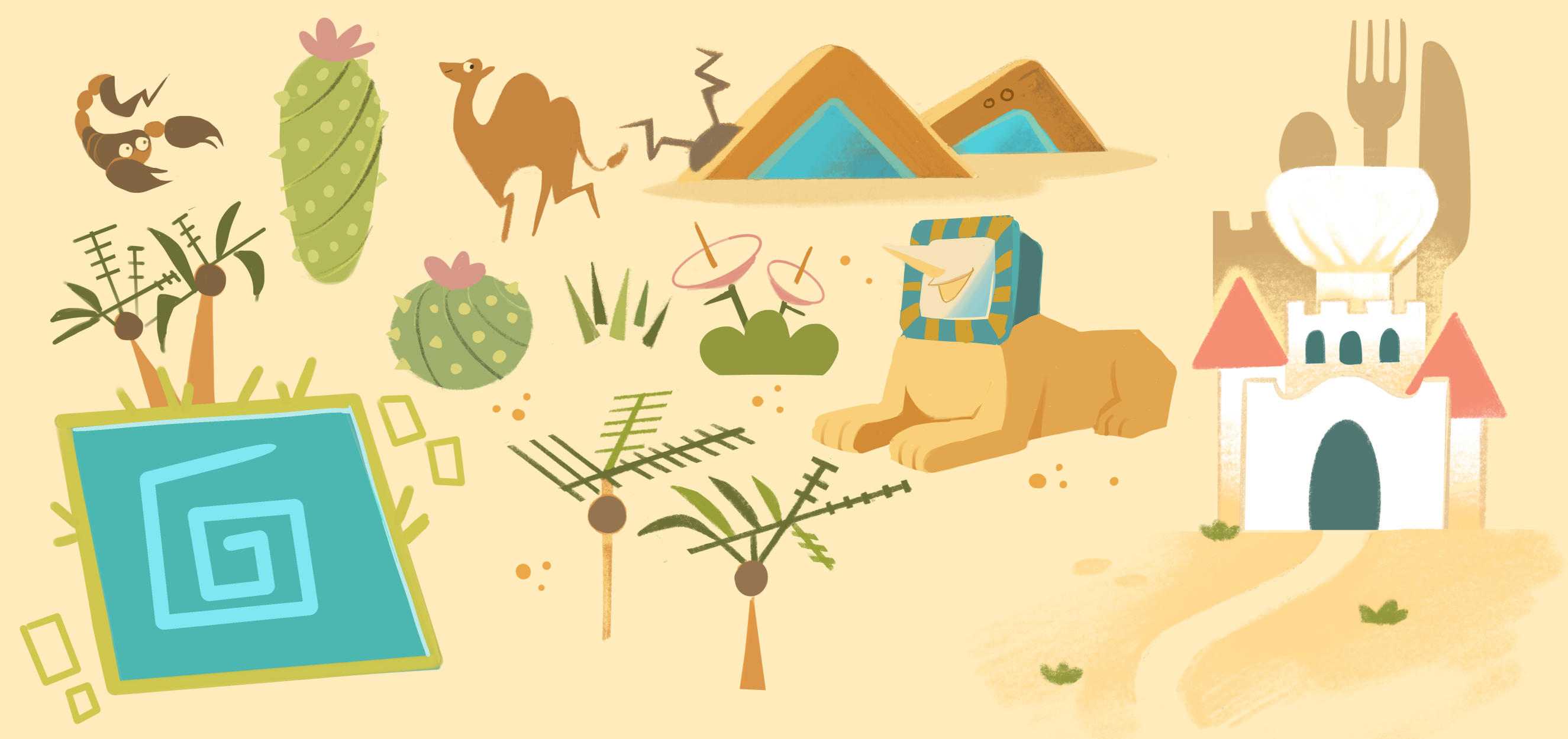 僕が最初に考えていたコンセプトは、いろんなヘンテコなパーツを組み合わせて、いわゆる「ピタゴラ装置」を作る、というものでした。たとえば、「おやつ発射マシン」でおやつをバスルームに飛ばすと、おなかを空かせたアズゴアがスージィとノエルのあいだに座りにくる…みたいな。